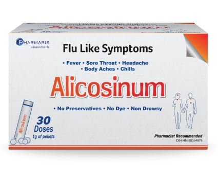 Alicosinum is an OTC homeopathic medication used to treat flu-like symptoms such as body aches, chills, fever, headache, and sore throat. Homeopathic medications are made from natural products. Alicosinum contains Anas Barbariae hepatis et cordis extractum 200 C which is being used in over 50 countries for more than 50 years for flu-like symptoms. Alicosinum is preservative-free, contains no dyes or colors, and has no artificial flavor. It is a 100 % natural product, Gluten free, Non-GMO, and sourced from a GMP-certified facility. This medication works with your body. Alicosinum single dose contains sweet-tasting melt-away pellets which quickly dissolves under the tongue and can be taken with or without food. It is easy to carry and can be taken anytime, anywhere, no water is required. Dissolve entire content of vial in your mouth and then swallow. Alicosinum is recommended for adults and adolescents over 13 years old. Take one, 1 gm vial of pellet one to three times daily. Each dose should be taken at intervals of 6 hours. The Medicinal Ingredient: Each tube of 1 g pellets contains: Anas barbariae hepatis et cordis extractum 200C and the Non-Medicinal ingredients: Lactose and Sucrose.