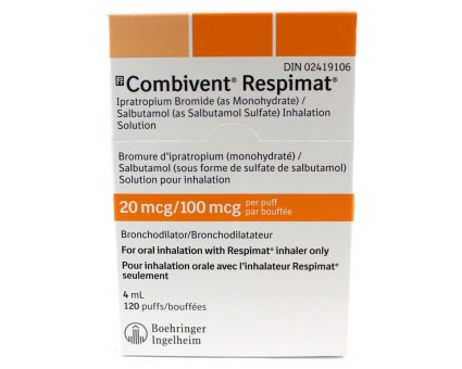 The brand Combivent Respimat 20 mcg/100 mcg/4 ml/120 dose comes from Canada by Boehringer Ingelheim. It is available in the quantity of one and three, 120 dose inhalers.