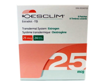 Brand Oesclim 25 mcg Patch comes from Canada manufactured by Searchlight Pharma. It is available in a box of 8 patches.