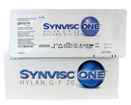 Brand Synvisc One Injection comes from Canada manufactured by Genzyme. The treatment pack including 1 disposable syringe containing 6 mL sterile hylan G-F 20.